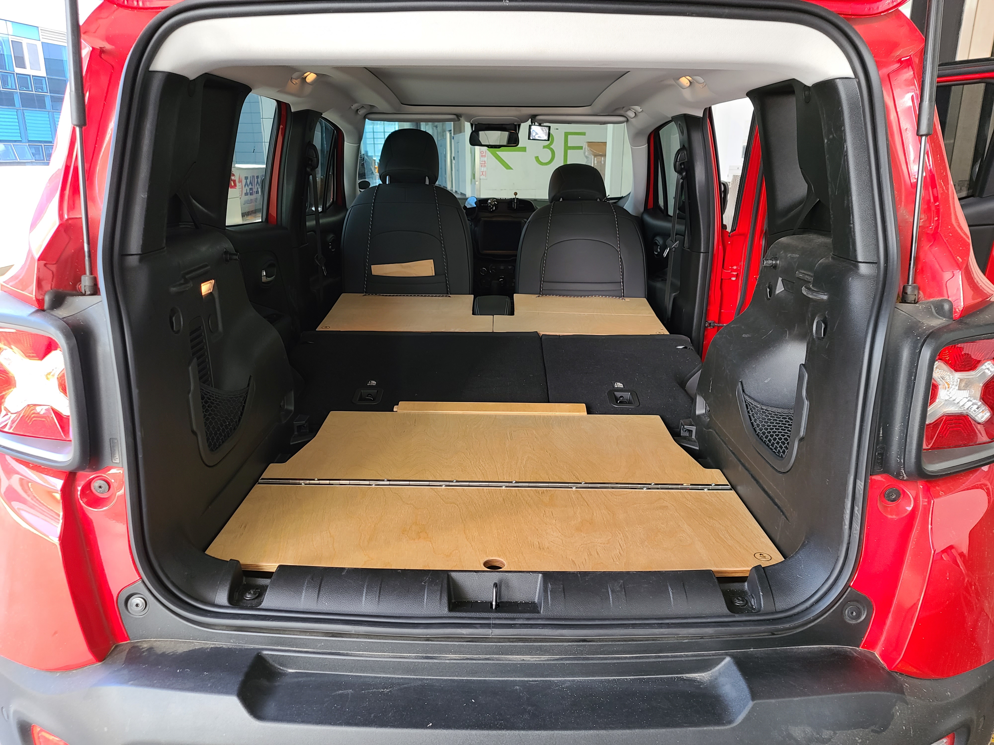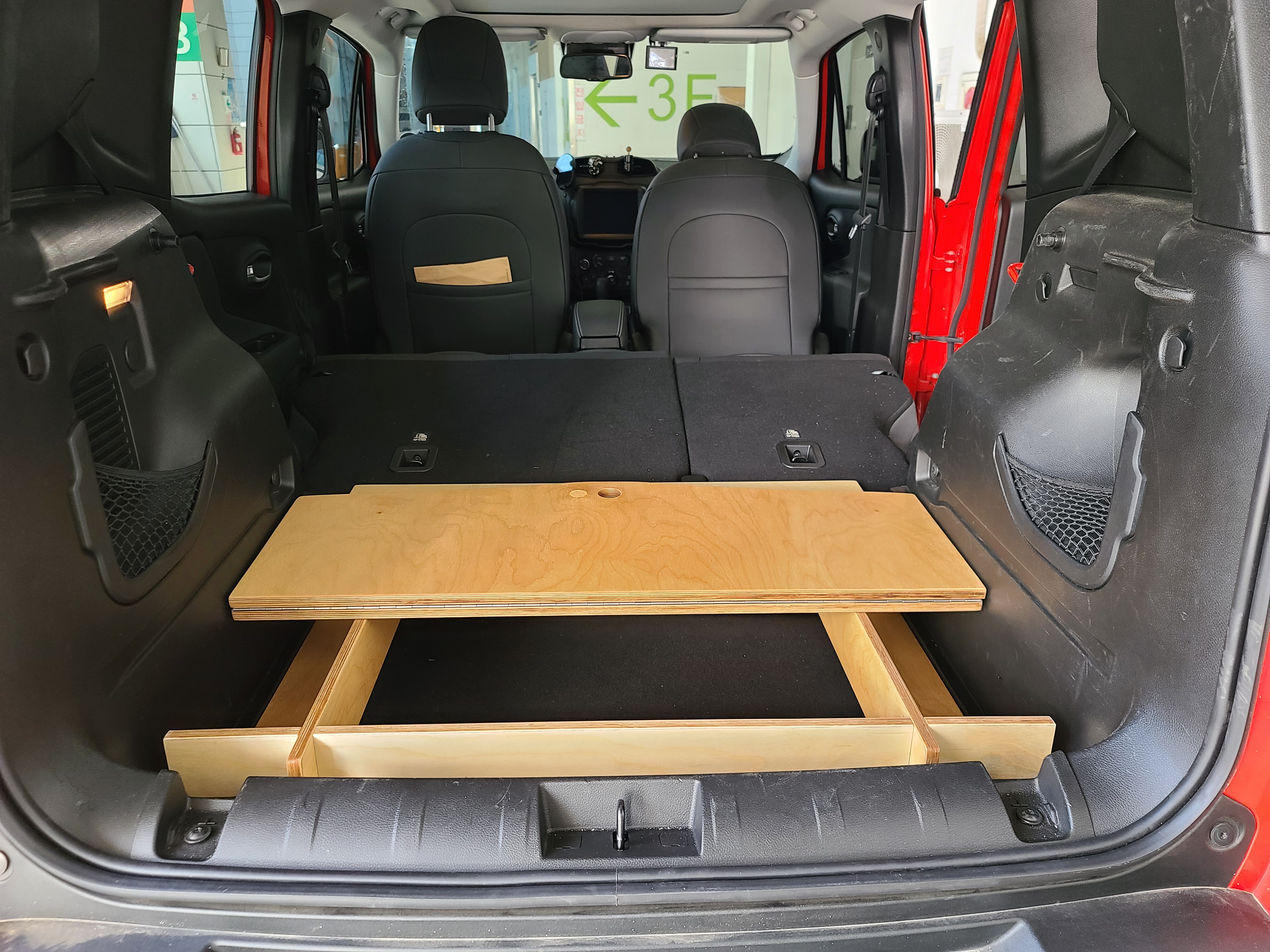 평탄품 설치를 위해 트렁크를 열어보니 차박 용품 가득